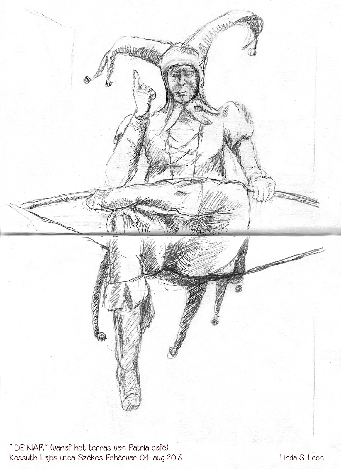 Vanaf het zomerterras van het café "Patria" te Székesfehérvar legde ik dit beeld vast in mijn schetsboek.
